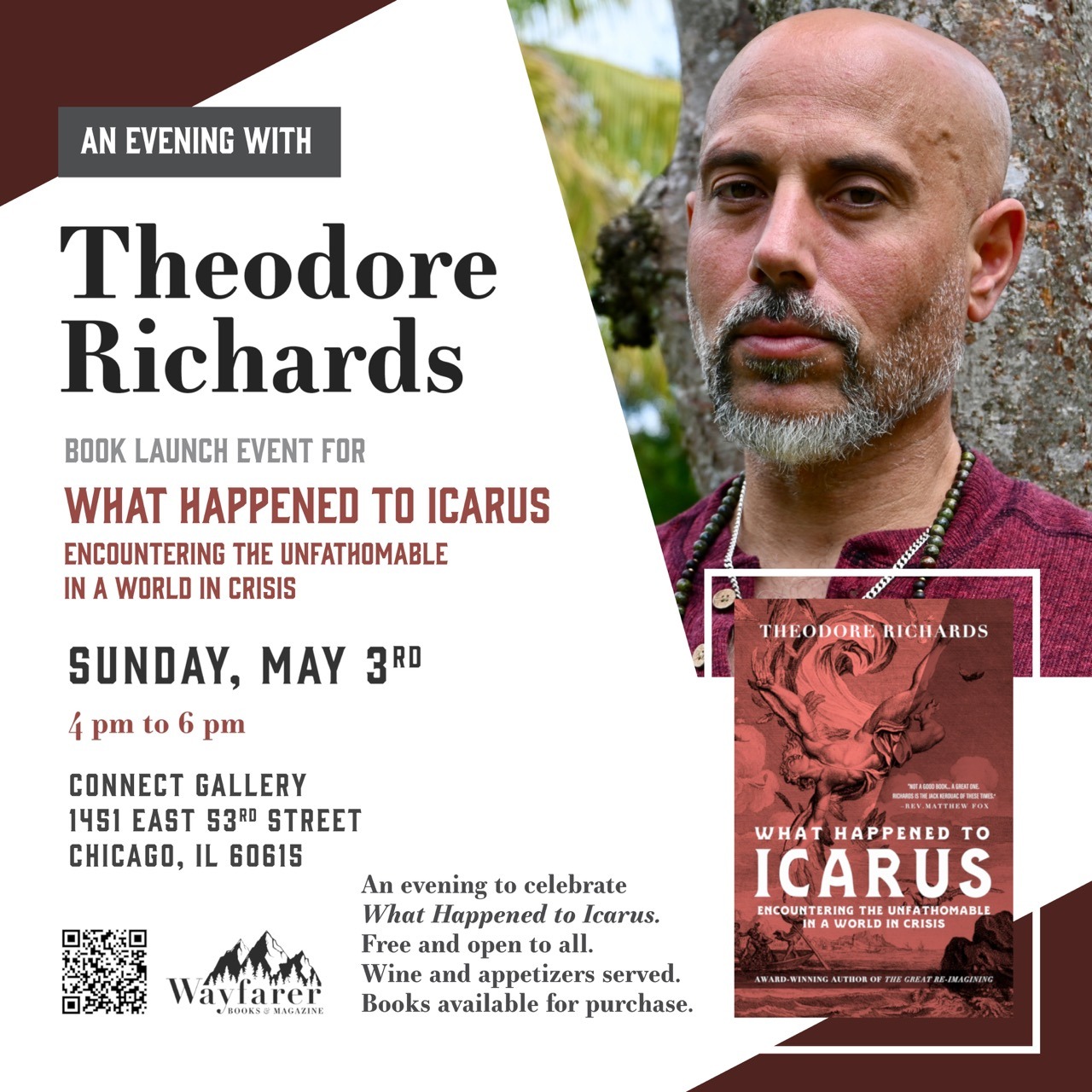 “On a lonely planet, in a far-flung corner of the Universe, there lives a human, digging in the depths of his soul, so that his species can heal and survive. Theodore Richards’ What Happened to Icarus is a deeply personal, poetic and philosophical book that weaves together real life narrative, social reckoning, cultural reflection and spiritual imagination. It is filled with the heart, honesty and human spirit that is essential for us to find our way. We are falling, but this is a vital part of the story…a story of love and loss and becoming.”